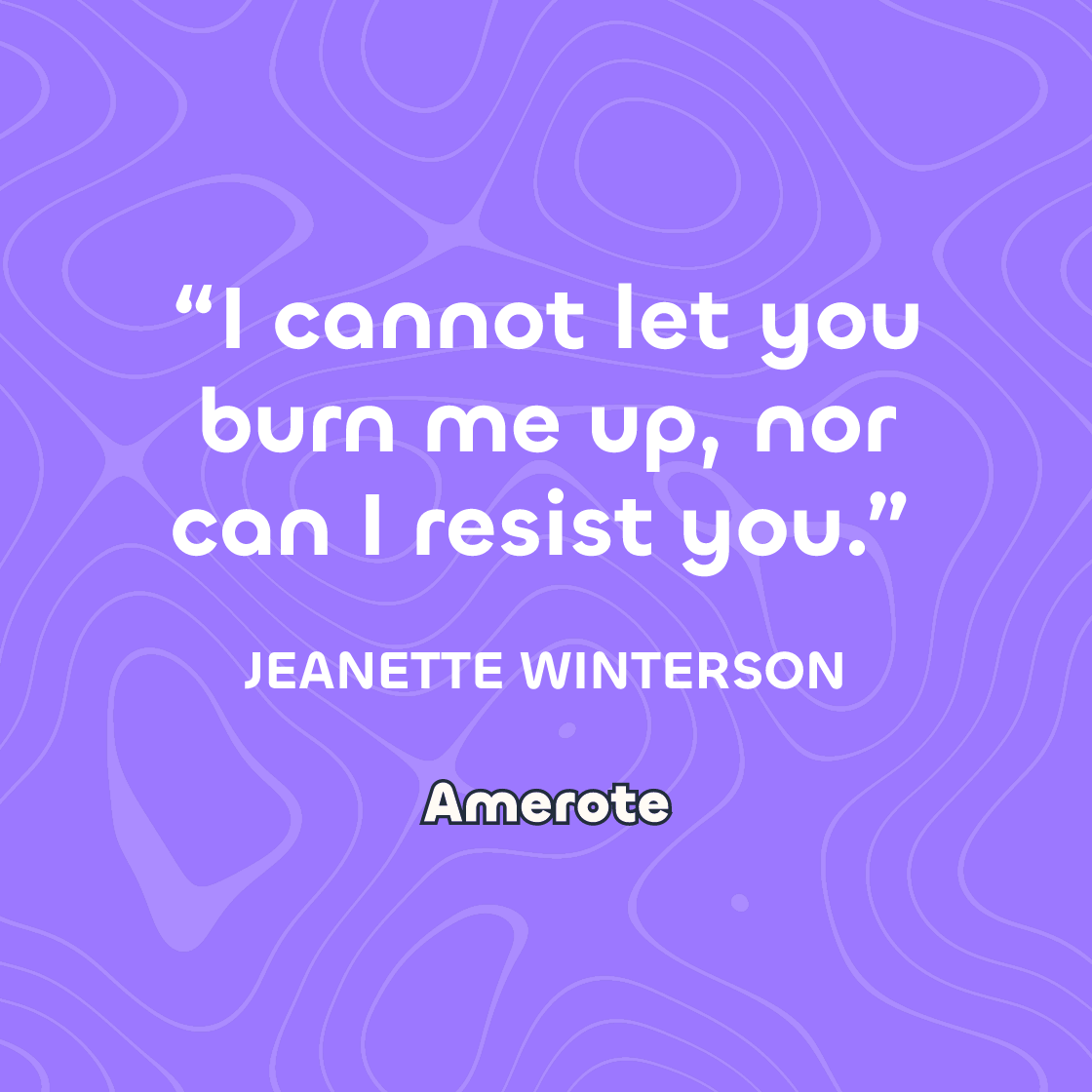 - “I cannot let you burn me up, nor can I resist you.” — Jeanette Winterson, Written on the Body (1992)