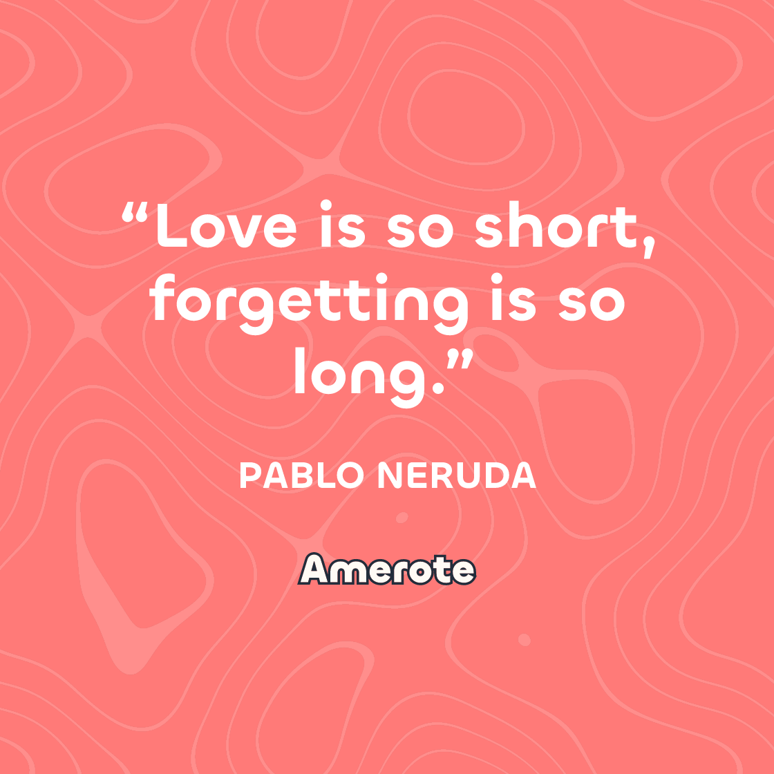 - “Love is so short, forgetting is so long.” — Pablo Neruda, “Tonight I Can Write the Saddest Lines,” Veinte poemas de amor… (1924)