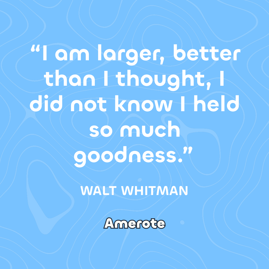 - “I am larger, better than I thought, I did not know I held so much goodness.” — Walt Whitman, Leaves of Grass (1855)